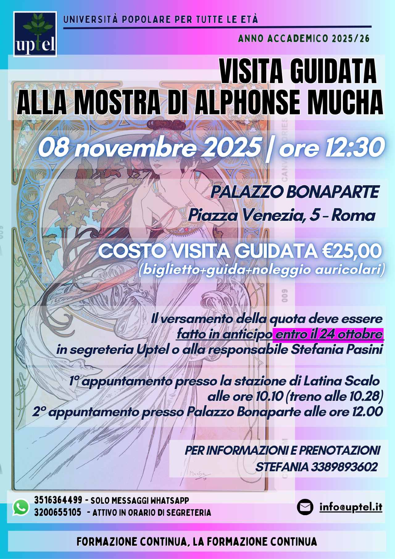 Palazzo Bonaparte si trasforma nel tempio dell’Art Nouveau, presentando la mostra più ampia e completa mai realizzata su Mucha, allargando il panorama ai grandi artisti di ogni tempo che si sono confrontati con il tema della bellezza e della seduzione femminile.